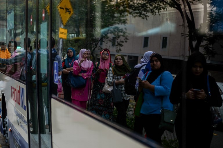 In this file photo taken on April 04, 2016 Malaysian women are reflected on the windows of a bus in Kuala Lumpur. The capital was flooded with protesters dressed in white, who were bused in from around the country to assemble from Saturday afternoon. The United Malays National Organization, which lost its six-decade hold on power in the general election, had vowed to bring 200,000 supporters, and said co-organizer PAS, an Islamist party, would mobilize another 300,000. (AFP/Mohd Rasfan)