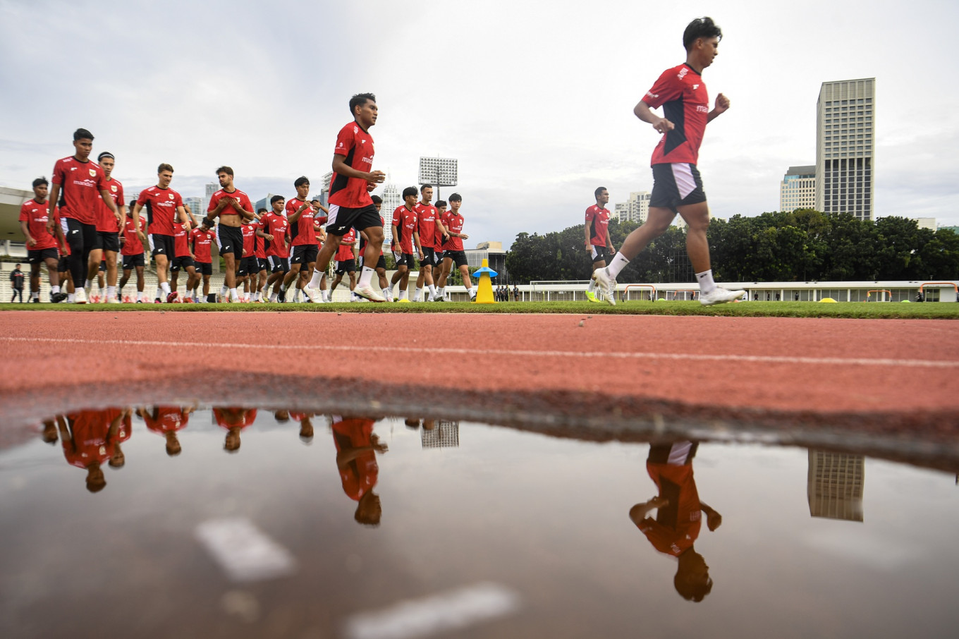 Players of Indonesia's under-22 (U-22) men's national soccer team warm up during a training session at the Madya Stadium of Gelora Bung Karno (GBK) sports complex in Jakarta on Nov. 11, 2025. The team will compete in the 2025 Southeast Asian Games (SEA Games) in Thailand from Dec. 9 to 20. (Antara/Muhammad Adimaja)