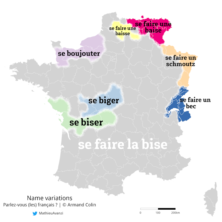 It is a less known fact that the way in which French speakers refer to the action of greeting with a kiss also varies. Our surveys enabled us to map with precision the areas corresponding to the use of seven regional verbs and expressions.