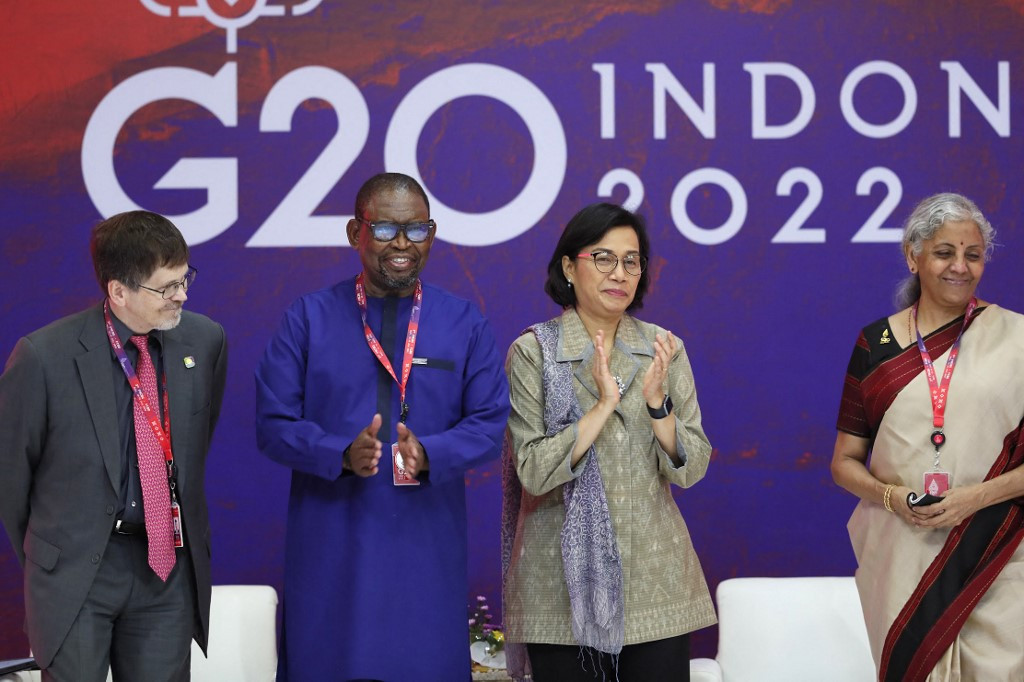 US Undersecretary of International Affairs Department of Treasury Andy Baukol, South African Finance Minister Enoch Godongwana, Indonesia's Finance Minister Sri Mulyani Indrawati and Indian Finance Minister Nirmala Sitharaman (left to right) pose for photos prior to a side event on the G20 Finance Ministers and Central Bank Governors Meeting in Nusa Dua, Bali on July 14, 2022. ( AFP/Made Nagi)