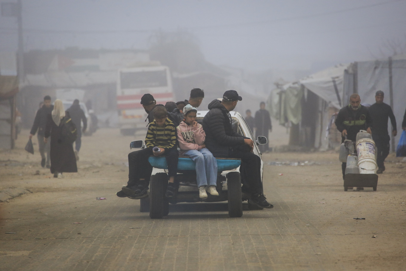 Palestinians ride on the back of a car-pulled cart in Khan Yunis, in the southern Gaza Strip, on Feb. 10, 2026. A United States-brokered ceasefire, which sought to halt the fighting between Israel and Hamas sparked by the group's October 2023 attack, took effect last October, reducing the level of bombing and fighting. Palestinians ride on the back of a car-pulled cart in Khan Yunis, in the southern Gaza Strip, on Feb. 10, 2026. A United States-brokered ceasefire, which sought to halt the fighting between Israel and Hamas sparked by the group's October 2023 attack, took effect last October, reducing the level of bombing and fighting. (AFP/Bashar Taleb)